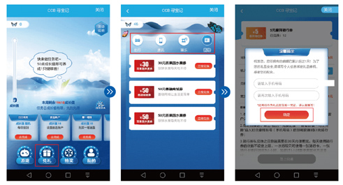 建行于2018年8月20日—2018年12月31日期间,面向所有用户创新开展主题为“CCB寻宝记—您的专属小任务”的手机银行优惠活动,用户报名后完成“天天签到”“购买速盈”“扫码收款”“申请快贷”等随机指定业务的过程中,便可自动获取活动成长值,积累一定成长值后便可兑换各种礼品。此外,活动还增设了“抓金币”游戏及“幸运大转盘”抽奖两大专区。