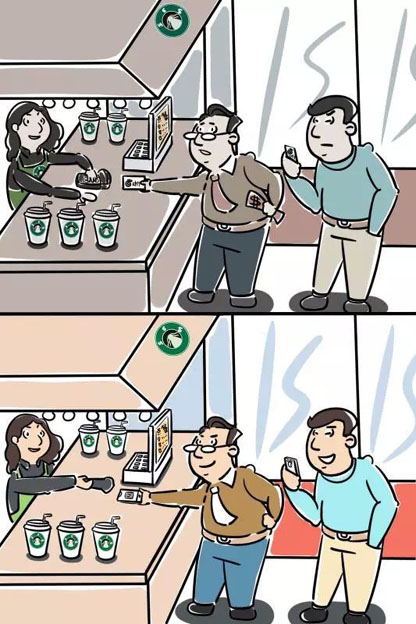 几年前,在商场像星巴克这种连锁商户,买东西支付渠道较多,收银员操作复杂,客户等候时间长,现在有了建行智慧商圈,人脸支付、无人收银、扫码枪二维码收款,让你手机不离手就把账结清了。