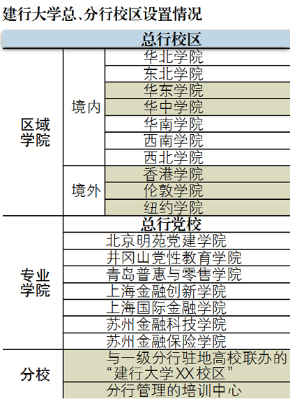 建行大学总行区域校区有10个,境内7个校区均衡分布全国,境外3个校区分别位于香港、伦敦、纽约;另设若干专业校区,作为党性教育、三大战略、金融创新的培训平台。(表1)