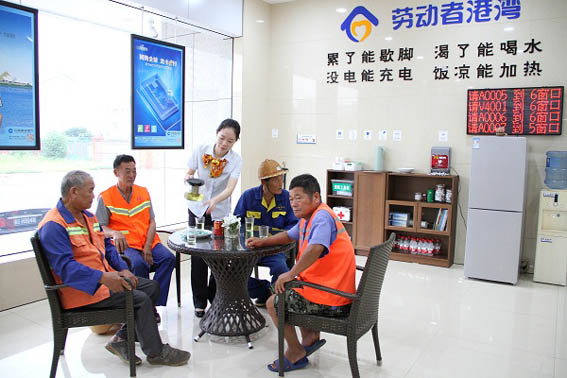 小曹忙对宋阿姨说道:“没关系的,我们大家都是劳动者,你们为城市建设服务,我们就为你们服务,而且在我们这里累了能歇脚,渴了能喝水,没电能充电,饭凉能加热。工友们如果没有地方休息,也欢迎来我们的‘劳动者港湾’。” 宋阿姨听了很惊讶:“真的吗?饭凉了能加热?那我去跟我老公说一下吧。”小曹笑着答道:“是的,我们有提供微波炉。我在建设银行,就在这边上。” 宋阿姨非常开心地说:“知道的,知道的。你们建行人的服务态度就是好。”说完宋阿姨便去找她老公,最后两人一起走进了“劳动者港湾”……