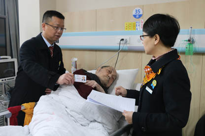 在到达客户所在的医院后,朝阳洞支行员工首先送上食用油和春联红包等节日礼品,向老人表达了新春的慰问。本着风险防控的要求,与客户进行交谈,核实客户身份,在提供便民服务的同时,有效防控风险。并且指导老人在相关单据上签字并加盖手印完成操作,随后在他们的一再感谢下离开了医院。在办理完相关手续后,中午又为客户子女单独开设柜台,办理了存折更换的手续。