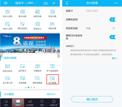 还有小额免密享便捷。登录手机银行后,点击“信用卡”-“支付管理”,打开消费免验密开关,设置免验密金额。