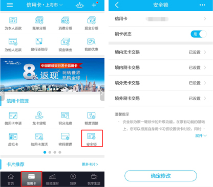 哪里查看锁卡状态?登录手机银行,点击“信用卡”-“安全锁”。