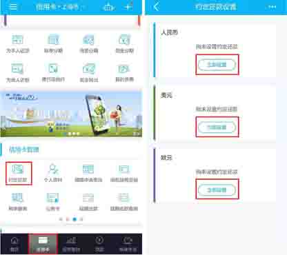登陆“中国建设银行”手机银行,点击【信用卡】-【约定还款】,成功绑定后,到期还款日当天上午将自动从建行储蓄卡账户扣划相应资金归还信用卡。