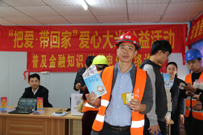 最近,建行广东省东莞分行领导带队走进了万科东心翡翠松湖建筑工地,开展“把爱.带回家”爱心公益活动,为在场的民工兄弟送上“爱心大米”,并提供温暖实惠的全方位综合服务。