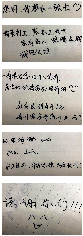 随着白纸不断地被勾画填充,客户的业务也顺利办结,通过进一步的了解,仇新敏被客户虽身残志坚的精神所感动。他想通过自己的双手赚钱养家,这次来就是办理工资卡。客户写到,本以为会遇到许多困难,没想到建行的服务这么优质、高效,他打心底里感谢。