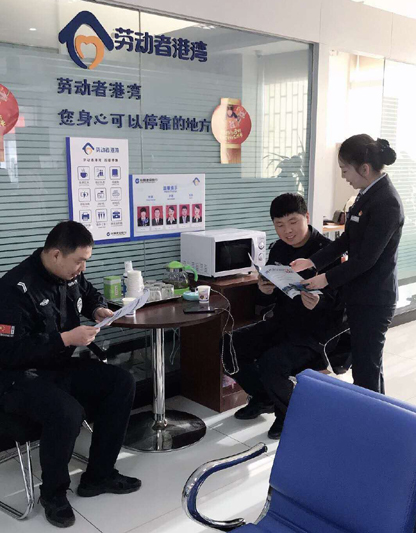 警察休息期间走进新疆区分行“劳动者港湾”,他们放下手机在这里读书看报。■ 杨咏梅/摄