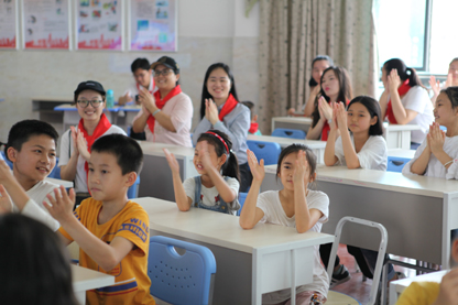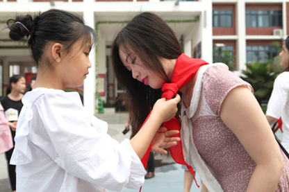 青年志愿者们刚刚走进明天学校的大门,活泼可爱的孩子们就叽叽喳喳地围了上来,给每一个青年志愿者戴上红领巾。