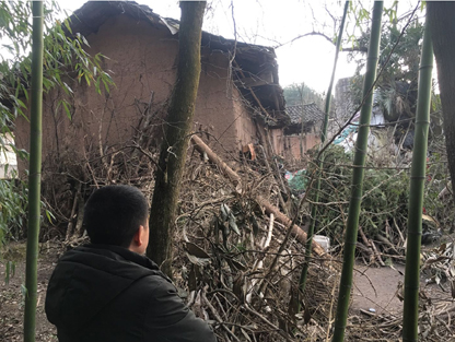 易前喜是年近花甲的聋哑人,没读过书,是我村五保户和特困贫困户。最近发放特困户御寒棉衣时,我发现他的住房开始出现裂缝,房顶有下塌迹象。易前喜家只他一人,个性偏古怪,不具备语言交流能力,又因年迈丧失了劳动能力,平日靠政府救济和捡垃圾维持生活。他住的那间百来平米的房子有些破旧,房屋四周堆着一两米高的枯枝,院坝里屯着满满的废弃饮料瓶,院子前面是长满灌木的陡坡,他堆枯枝的目的无疑是想将自己的“领地”和外人分割开来。若不是他自己走出院子,我们完全找不到他庭院的出入口。