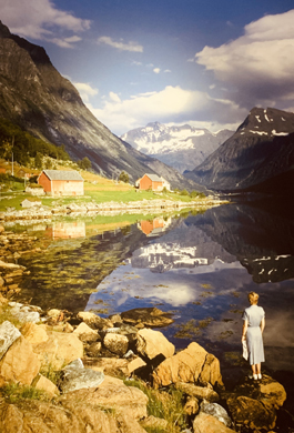 白雪点缀的山峰和红色的谷仓倒映在诺朗峡湾里