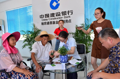 福建省南平分行设立“裕农通+益农信息社+退役军人”模式“村口银行”。“裕农通”退役军人业主余利静为赶集的大婶办理取款。