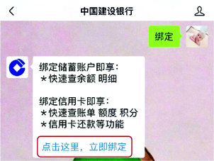 微信关注“中国建设银行”公众号且绑定信用卡的客户均默认自动开通信用卡微信账户变动提醒,还没绑定信用卡的客户可在“中国建设银行”微信号内输入“绑定”,根据界面提示操作。