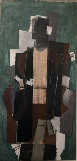 毕加索于1907年创作的《亚威农少女》是第一张被认为有立体主义倾向的作品,它不仅标志着毕加索个人艺术历程中的重大转折,而且也是西方现代艺术史上的一次革命性突破,引发了立体主义运动的诞生。《亚威农少女》开创了法国立体主义的新局面,毕加索与勃拉克也成了这一画派的风云人物。在这幅画中,我们可以看到这些女性似乎是被扭曲着表现出来的,但实际上最左边的带有埃及常有的正面律的姿态,而中间两个人的脸上我们可以看到西班牙古伊比利亚雕刻的痕迹,右边女性则是受到非洲艺术的影响,每个形象都是毕加索深思熟虑而创作出来的,是他在丰富的知识背景下的创新。但非常可惜,在这次展中并没有这张作品。