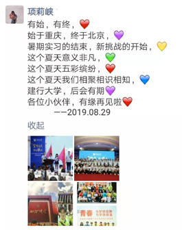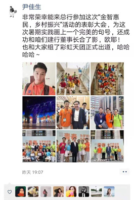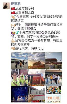 建行大学“金智惠民—乡村振兴”万名学子暑期下乡实践活动落下帷幕,获奖学生代表于8月29日在北京参加了 “青春为梦想绽放 青春为梦想担当”万名学子暑期下乡实践汇报交流活动,建行大学对获奖个人及集体进行了表彰,学生们自编自导自演了精彩的节目。活动结束后,有感而发的学子们在朋友圈里也纷纷晒出了属于他们的青春收获和骄傲。