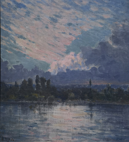 法国印象派画家亨利·维涅的作品《云彩印象》,描绘了天、地、云、水这四类形态多变的图像元素相互渗透、彼此影响,光线在四者间的多次反复和折射,造就了多样的视觉效果。天空中散碎如棉絮的云朵,呈现出乳白、浅粉、水蓝、深绿等微妙的色彩变化,在水面上映出的倒影,似乎随着晚风轻轻颤动,一切都是这样如诗如画、浪漫之极。正如王勃在《滕王阁序》中描绘太阳落山之景:“潦水尽而寒潭清,烟光凝而暮山紫。”“暮山紫”,是一种相当诗意的形容,夕阳的光透过交织在一起的烟雾,山透出薄紫色的光。这是属于诗人的颜色。我们看到这幅画,会联想到夏日的雨后黄昏,北京天空呈现的迷人风景。而这样的黄昏,“无人与我立黄昏,无人问我粥可温”。相信每个人在看这幅画时,都会激起自己独特的记忆和情感波动。