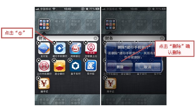”,在提示框选项中点击“删除”,即可卸载建行手机银行客户端。