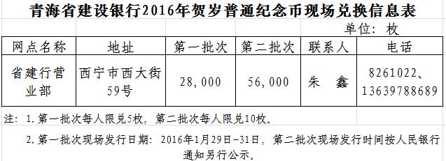 青海省建设银行2016年贺岁普通纪念币现场兑换信息表
