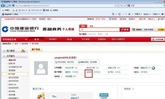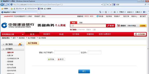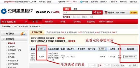 第一步:注册善融商务用户名并开通商城账户(操作流程详见网站www.ccb.com/nb服务指南栏位下《善融商务注册流程》) 第二步:登录善融商务个人商城(buy.ccb.com),点击首页左上角“会员登录” ![]() 第三步:登录后点击页面右上角“我的商城” ![]() 第四步:点击“定向券” ![]() 第五步:点击“我要获取”(获券成功后可在“我的商城”下“定向券”,“使用范围”中查看所获取的电子券使用范围,注意电子券使用不找零,每张仅限一次使用) ![]() 输入“电子券编号”、“验证码”,点击提交完成充值,如有多张电子券要进行充值,点击“添加”按钮 ![]() 注意:获券成功后可在“我的商城”下“定向券”,“使用范围”中查看所获取的电子券使用范围,注意电子券使用不找零,每张仅限一次使用。以下是查看电子券使用范围的详细操作流程: ![]() ![]() ![]() |