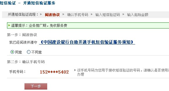 2、在阅读《中国建设银行自助开通手机短信验证服务须知》并点选同意后,请您确认在签约时预留的手机号码后点击“下一步”( 在您点击“下一步”按钮后,系统将自动从95533短信平台给您确认的手机发送6位数的短信验证码) ![]() |