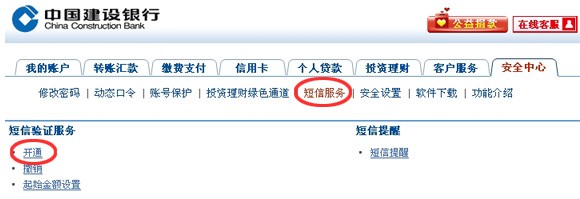 | 如果您已是我行一代网银盾用户,您可通过网上银行自助开通短信验证服务,开通后不仅可以进一步提高您网上银行的安全性,而且您的转账类单笔交易限额由5万元提高到500万元,单日交易限额由10万提高到500万。 一、在线自助开通流程 1、登录个人网上银行→进入安全中心-点选短信服务(插入网银盾) ![]() |