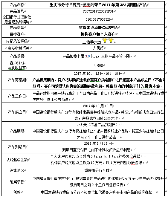 1.本期产品规模上限:3.0亿元。在本期产品募集期内,对本期产品的认购金额达到本期理财产品规模上限,则中国建设银行重庆市分行有权利但无义务停止本期产品的认购,已经认购成功的客户投资权益不受影响。