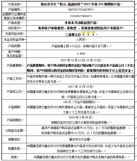 1.本期产品规模上限:3.0亿元。在本期产品募集期内,对本期产品的认购金额达到本期理财产品规模上限,则中国建设银行重庆市分行有权利但无义务停止本期产品的认购,已经认购成功的客户投资权益不受影响。