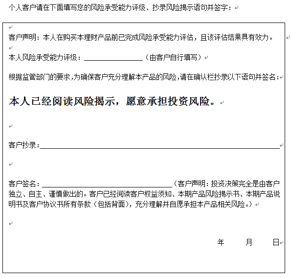在您签署《中国建设银行股份有限公司理财产品客户协议书》前,应当仔细阅读客户权益须知、本风险揭示书及本产品的产品说明书的全部内容,同时向中国建设银行重庆市分行了解本产品的其他相关信息,并自己独立做出是否认(申)购本产品的决定。