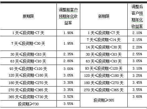 新客户预期年化收益率于2017年2月4日(含)起执行。对于2017年2月4日前已经购买成功且未赎回的所有存量客户投资本金,按照客户实际持有天数,其中2017年2月4日前持有部分执行原客户预期年化收益率,2017年2月4日(含)后持有部分自动执行新客户预期年化收益率,但以最终支付的实际年化收益率为准。